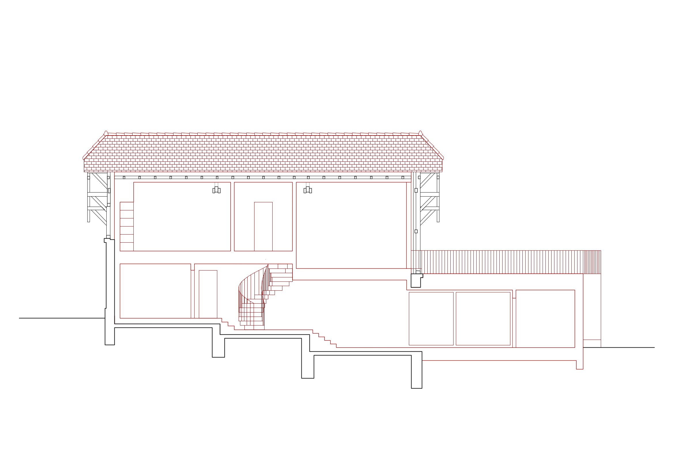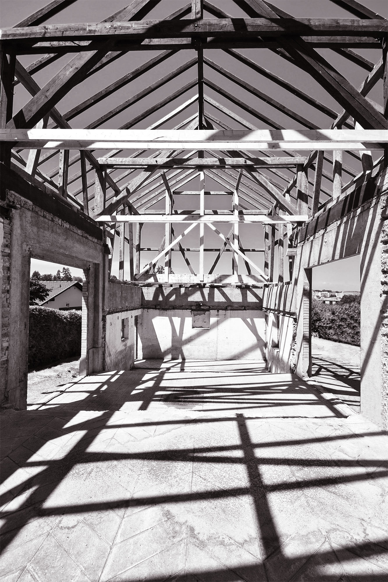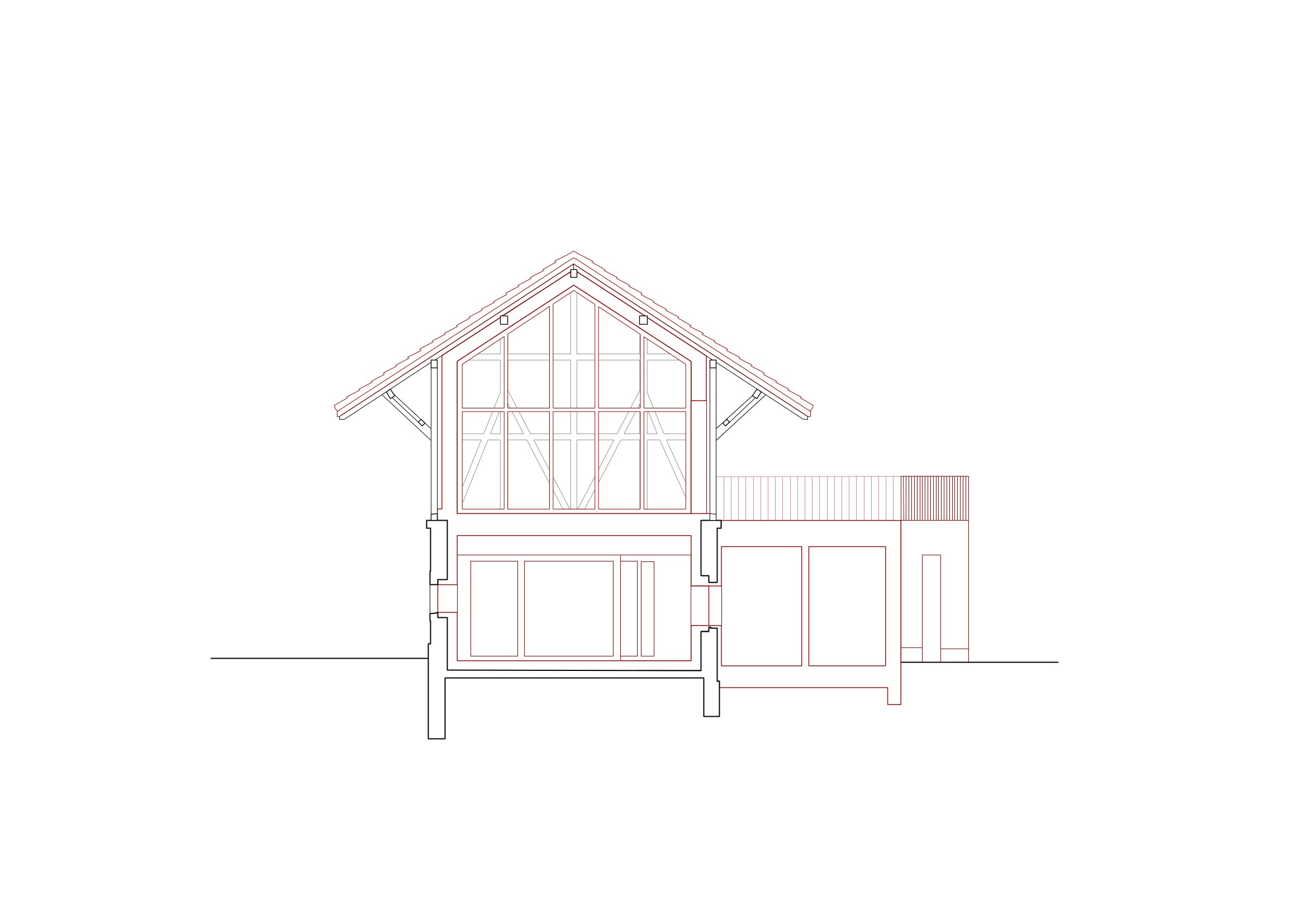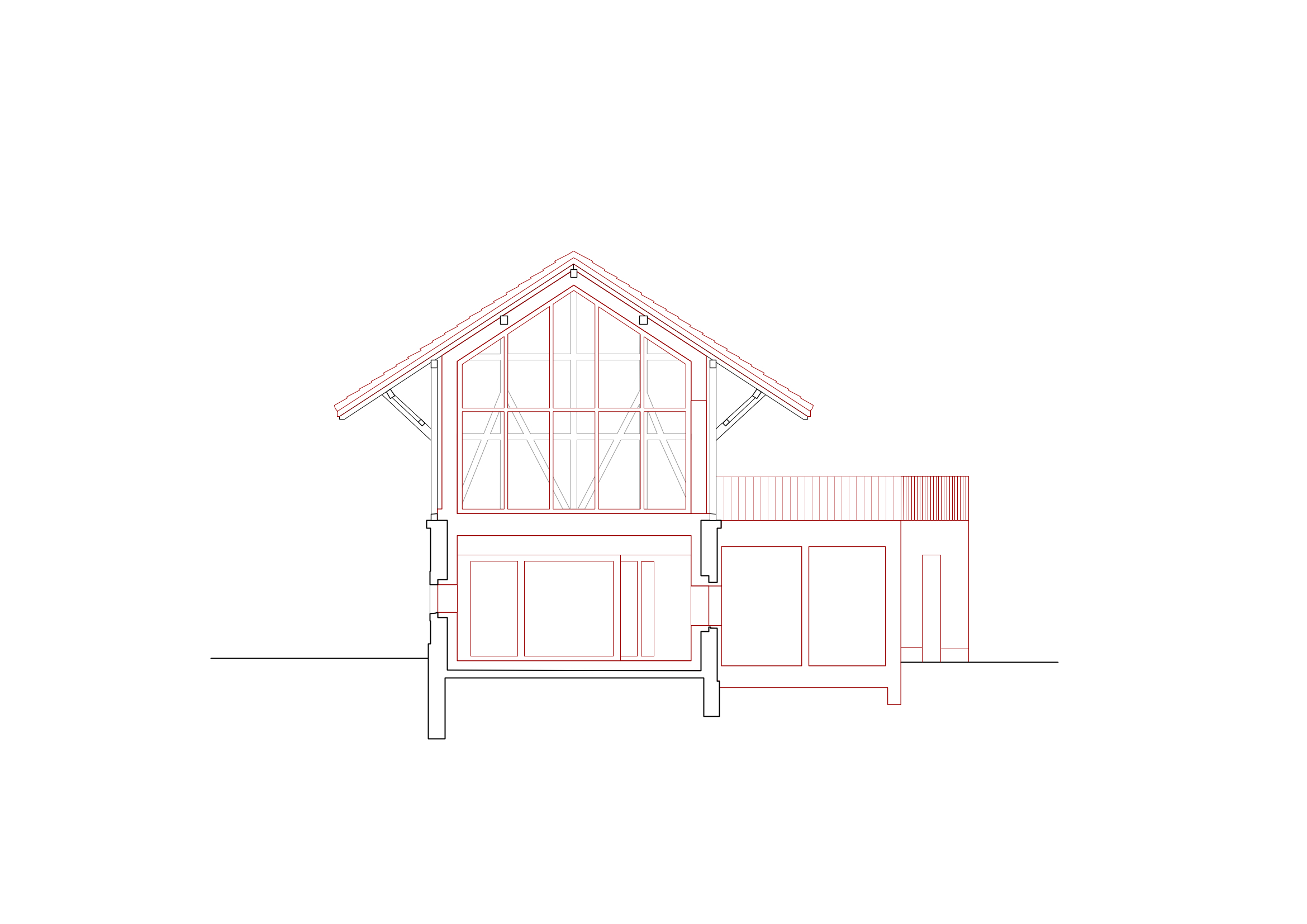 L’intervention s’appuie sur une observation précise de la substance existante ainsi que sur la volonté assumée de mettre en valeur les éléments conservés. La nouvelle habitation en construction bois est insérée dans le volume contenu à l’intérieur de la structure existante. L’intervention tire parti de sa tripartition. La tranche centrale, par laquelle on entre dans la nouvelle habitation, distribue de part et d’autre des travées réservées aux espaces de nuit et aux espaces de jour. Le volume de la grange est complété par un agrandissement dont l’implantation libère un espace réservé à un petit jardin privatif. Le léger angle donné à l’agrandissement marque la distinction entre intervention nouvelle et structure ancienne. Les nouvelles façades, constituant l’enveloppe thermique de l’habitation, sont placées en retrait de la structure existante. Teintées de noir, elles forment l’arrière-plan d’une « nature morte » mettant en lumière le tracé de la charpente ancienne.