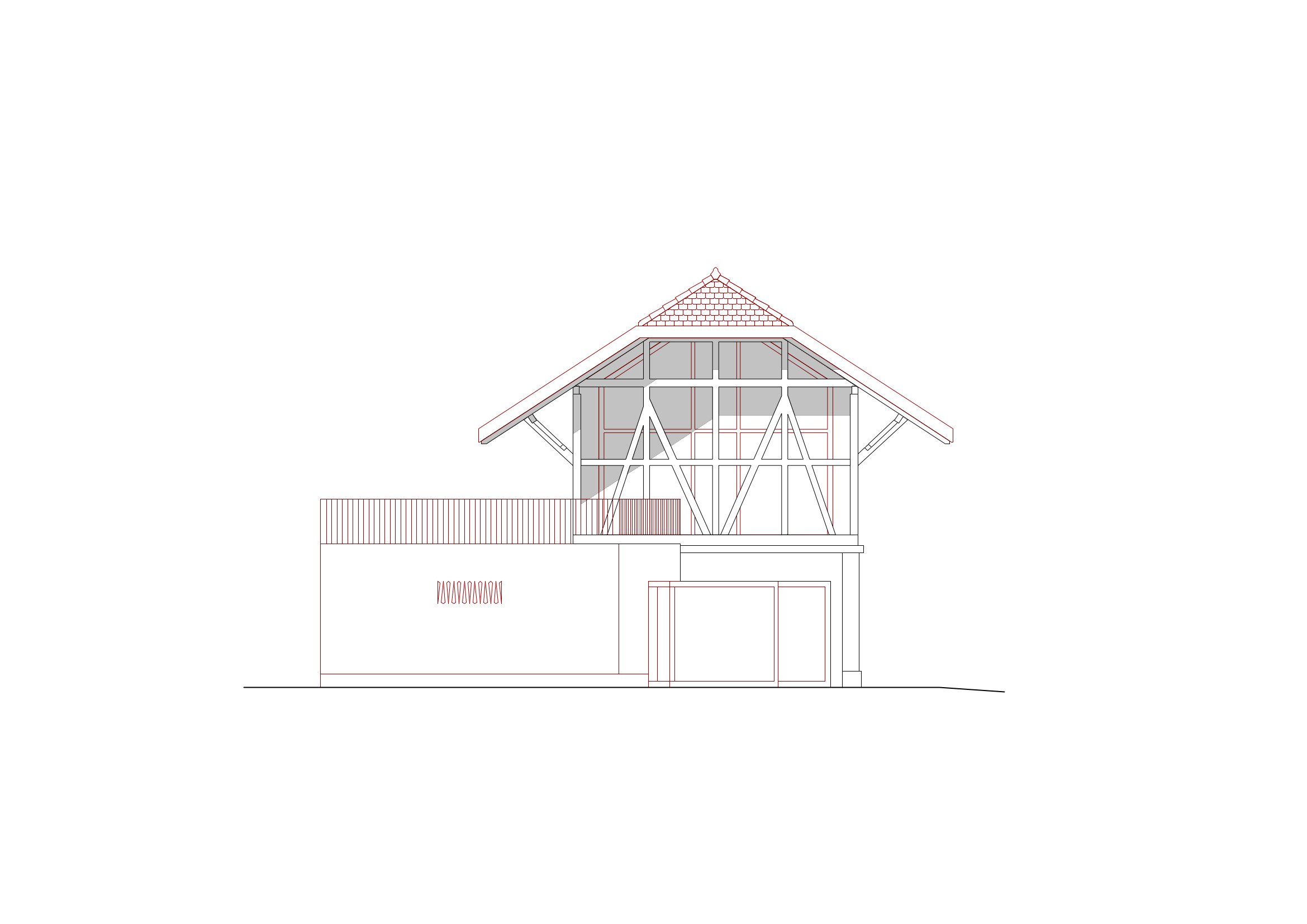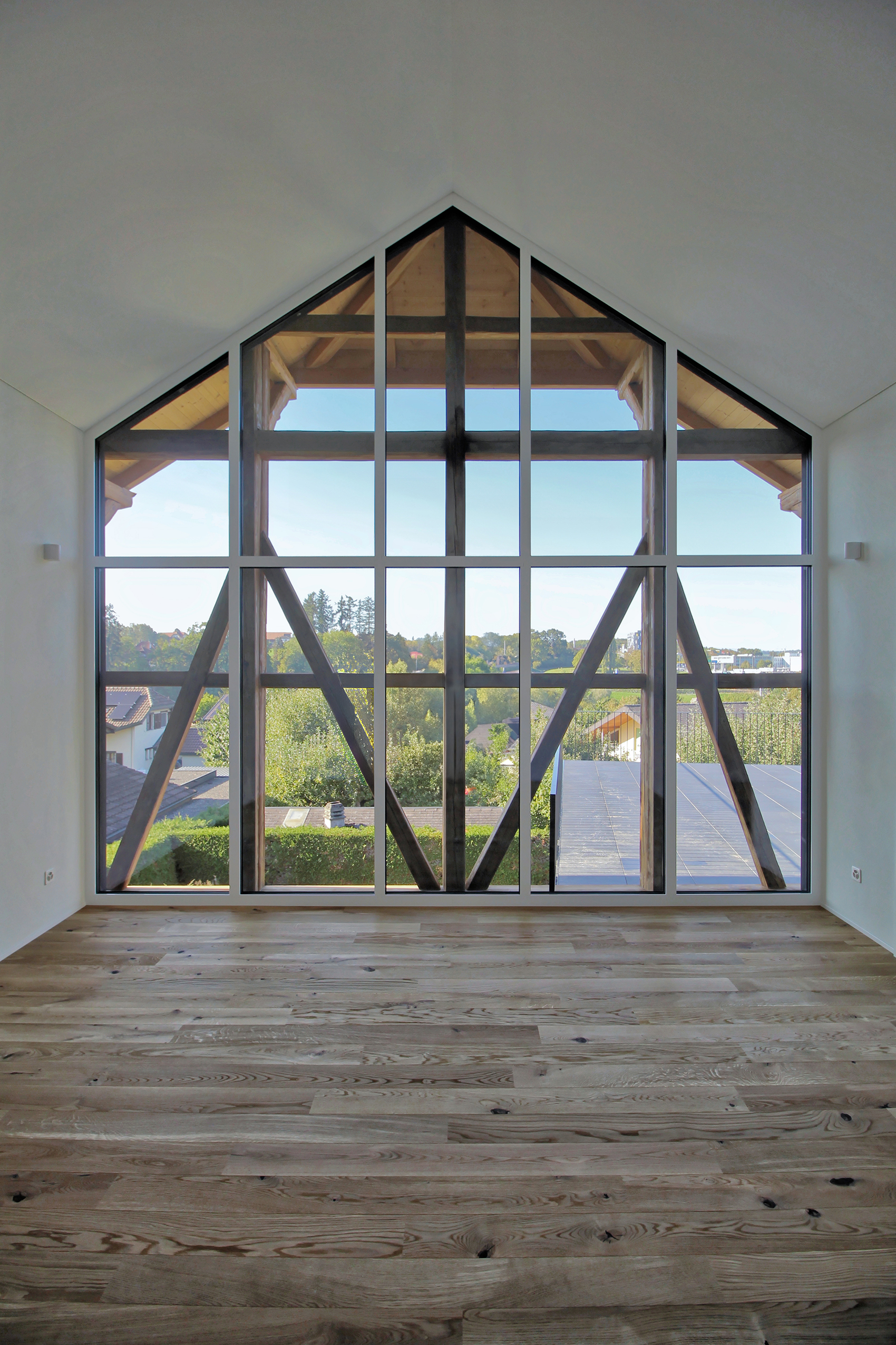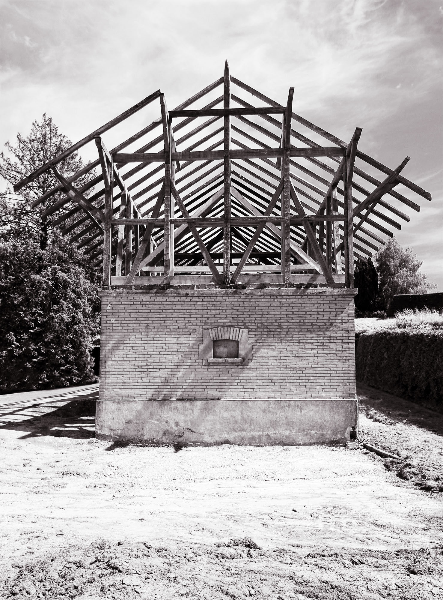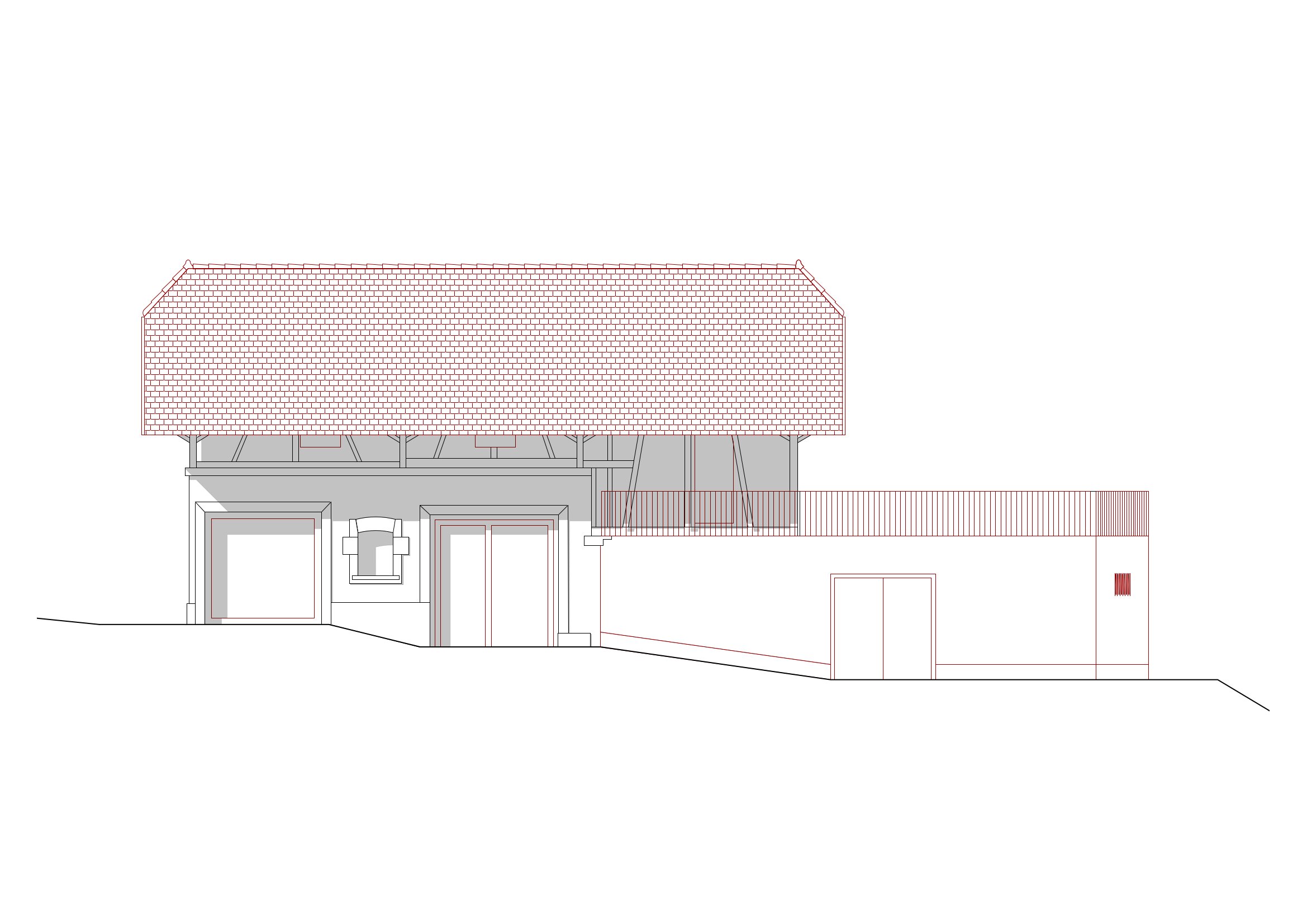 L’intervention s’appuie sur une observation précise de la substance existante ainsi que sur la volonté assumée de mettre en valeur les éléments conservés. La nouvelle habitation en construction bois est insérée dans le volume contenu à l’intérieur de la structure existante. L’intervention tire parti de sa tripartition. La tranche centrale, par laquelle on entre dans la nouvelle habitation, distribue de part et d’autre des travées réservées aux espaces de nuit et aux espaces de jour. Le volume de la grange est complété par un agrandissement dont l’implantation libère un espace réservé à un petit jardin privatif. Le léger angle donné à l’agrandissement marque la distinction entre intervention nouvelle et structure ancienne. Les nouvelles façades, constituant l’enveloppe thermique de l’habitation, sont placées en retrait de la structure existante. Teintées de noir, elles forment l’arrière-plan d’une « nature morte » mettant en lumière le tracé de la charpente ancienne.