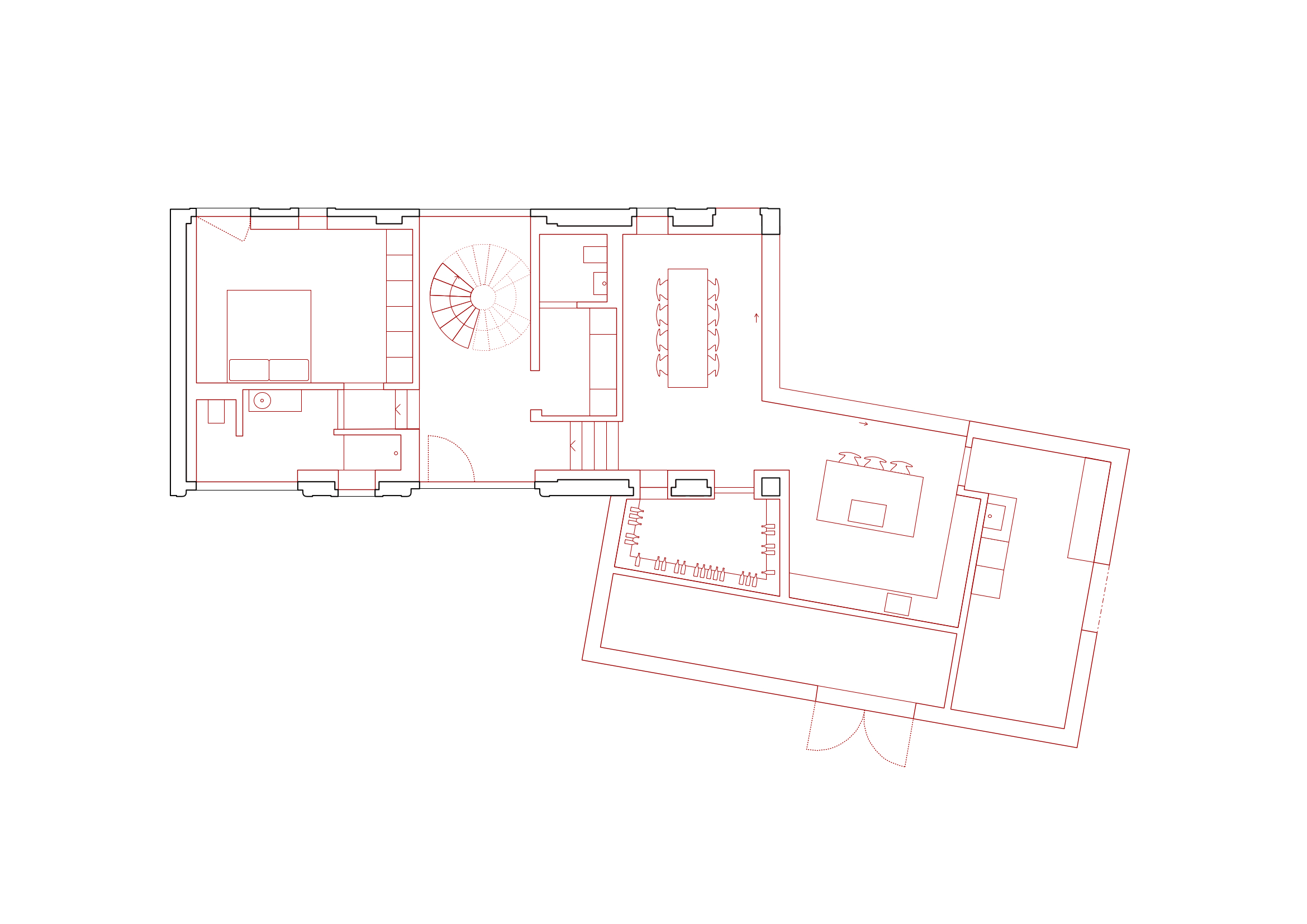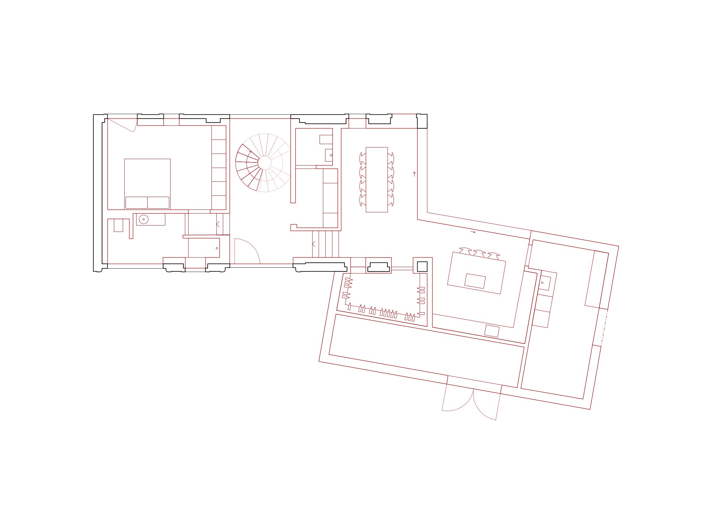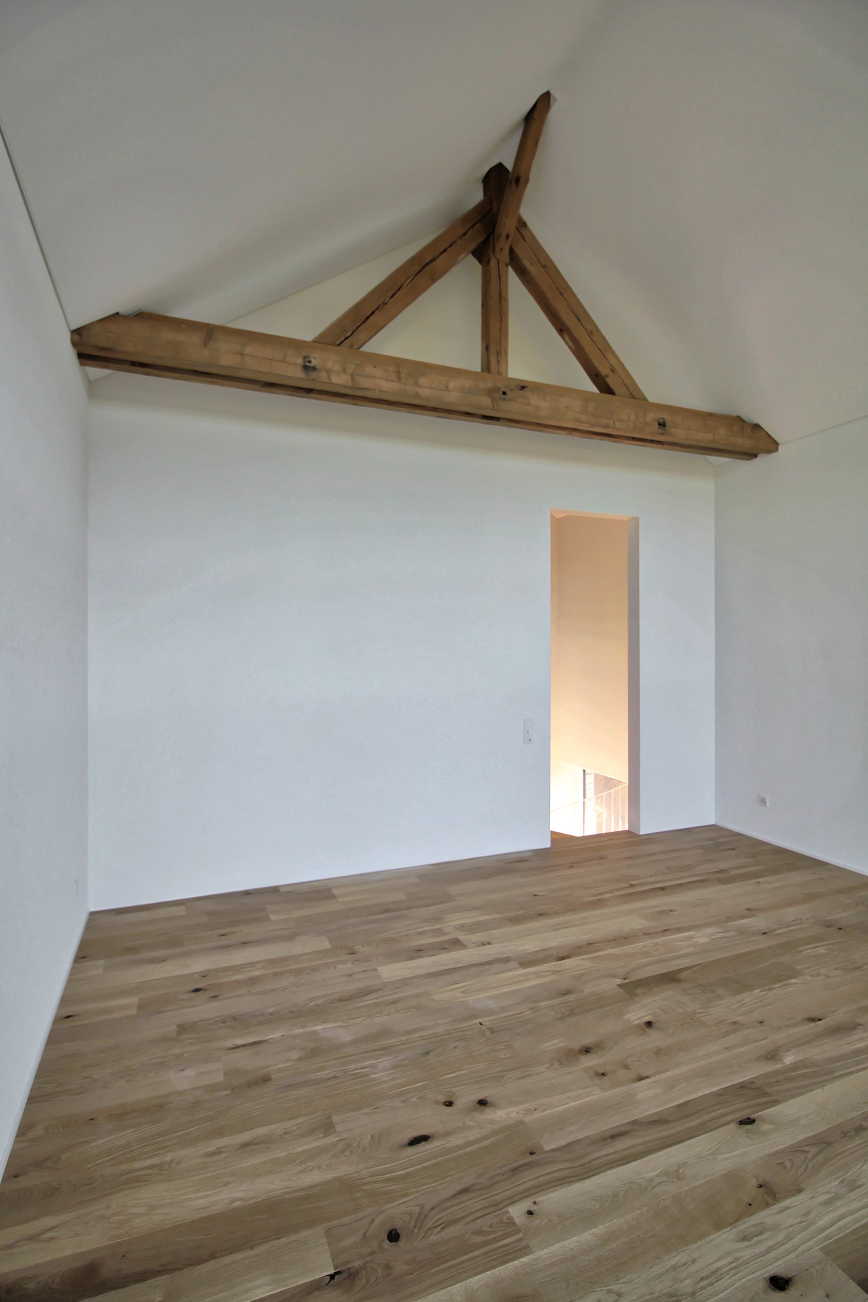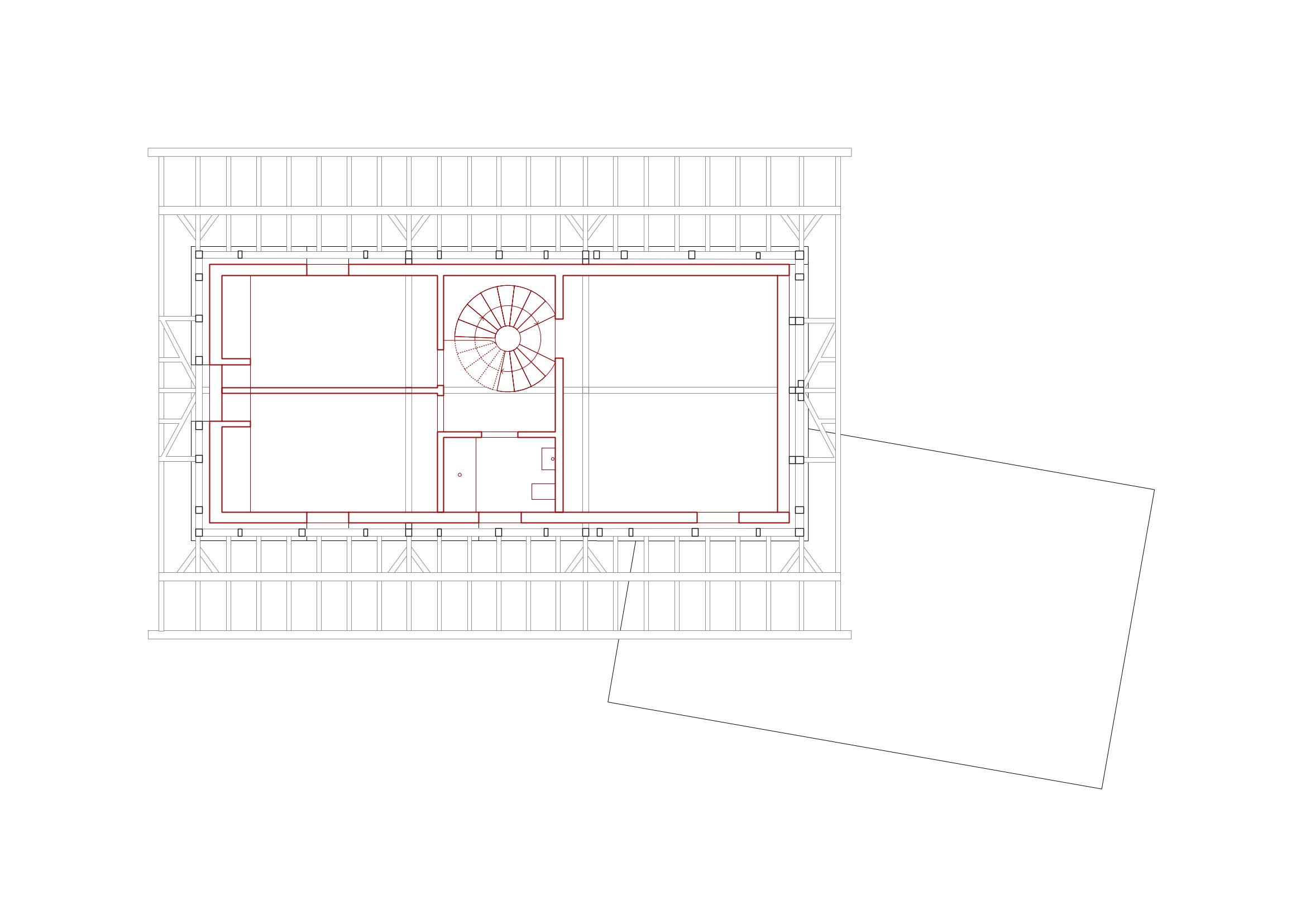 L’intervention s’appuie sur une observation précise de la substance existante ainsi que sur la volonté assumée de mettre en valeur les éléments conservés. La nouvelle habitation en construction bois est insérée dans le volume contenu à l’intérieur de la structure existante. L’intervention tire parti de sa tripartition. La tranche centrale, par laquelle on entre dans la nouvelle habitation, distribue de part et d’autre des travées réservées aux espaces de nuit et aux espaces de jour. Le volume de la grange est complété par un agrandissement dont l’implantation libère un espace réservé à un petit jardin privatif. Le léger angle donné à l’agrandissement marque la distinction entre intervention nouvelle et structure ancienne. Les nouvelles façades, constituant l’enveloppe thermique de l’habitation, sont placées en retrait de la structure existante. Teintées de noir, elles forment l’arrière-plan d’une « nature morte » mettant en lumière le tracé de la charpente ancienne.